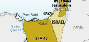 The Gaza strip is 363 kms long. It is located on the sout-western corner of Israel linking with Egypt to the southern edge and Mediterranean Sea coast to the west. It has a population of 10 lakhs.